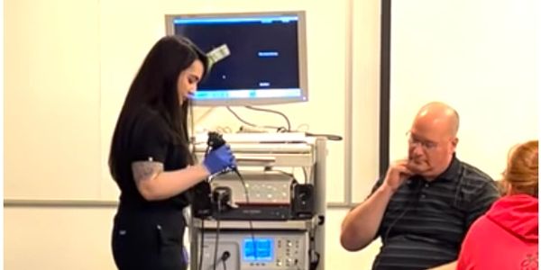 Alexa Liberi and Pentax Representative Jeff Splavec demonstrate flexible Videostroboscopy during SLP 518 Voice Disorders course at Saint Mary's College (October 25, 2022).
